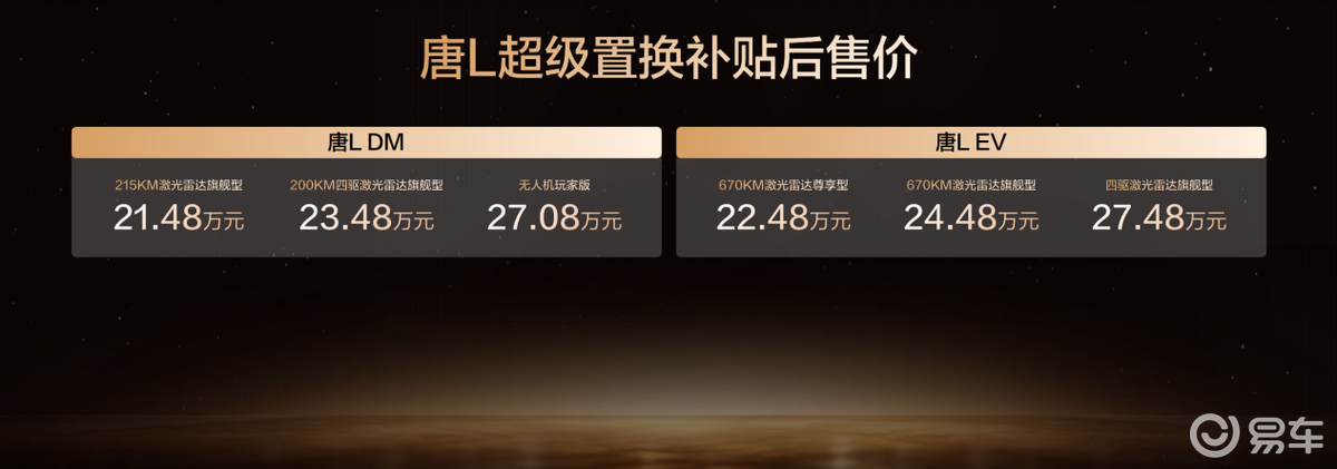 此次,唐L EV 3款车型,补贴后售价22.48万~27.48万元;唐L DM 3款车型,补贴后售价21.48万~27.08万元;同时,比亚迪还为用户准备了包含...