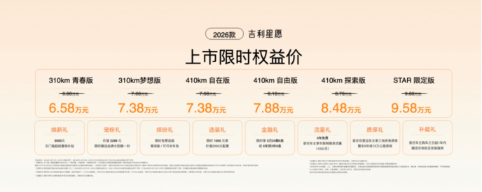 2026款吉利星愿上市限时权益价为6.58万元–9.58万元。同时为回馈用户支持,同步推出八重限时购车权益,包括焕新礼、宠粉礼、缤纷礼、选装礼、金融礼、流量...