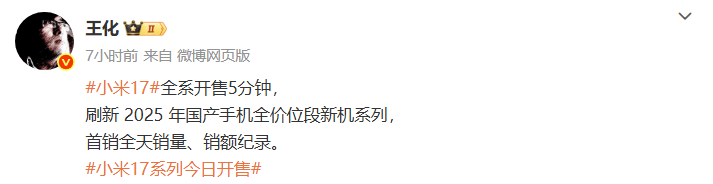 9月27日10时,小米17系列全渠道开售。 当天上午,小米集团公关部总经理王化在微博上公开表示,小米17全系开售5分钟,刷新2025年国产手机全价位段新机系列的...