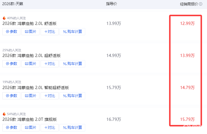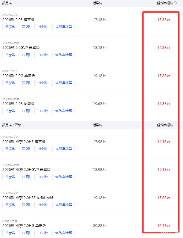 再来说说,凯美瑞,也是以2026款为例。虽然这车刚上市没多久,但为了保销量,终端也有不小的松动,入门版裸车价也在往13-15万靠。