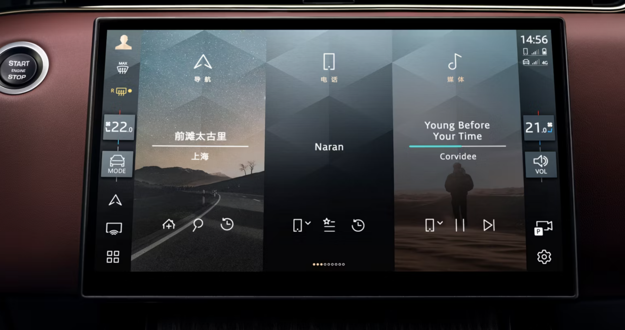 反观揽胜极光L,毫不夸张,直击笔者内心。奢华的内饰氛围,将“新现代豪华主义”的理念在揽胜极光L上彰显。大面积皮质材料包覆的仪表台被上方贯穿式空调出风口分割,层级感十足,简约的设计凸显其英伦简约豪华质感,尤其是中央这块11.4英寸的悬浮式中控曲面屏,整体所呈现出的“质感”真的无可挑剔,整个副仪表区域无物理按键的设计与新款揽胜如出一辙,尤其是这全新的电子挡把造型以及双层拼接缝合的方向盘,“高级感”自然会说话。