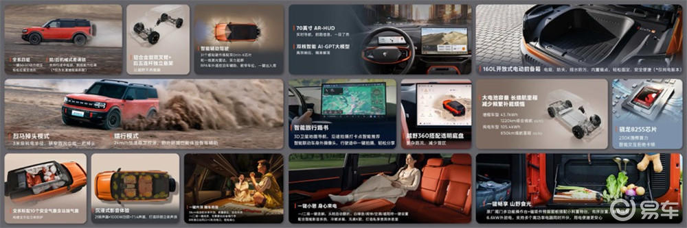 传承福特烈马家族的硬核基因,福特智趣烈马是同级唯一配备前后电控、机械差速锁的方盒子新能源SUV车型,全系标配四驱,增程版更配备了同级唯一的前后电控机械差速锁,独创行进中上锁功能,且不限速,脱困无比从容。即便是越野新手,在激光雷达、360°摄像头和底盘传感器、同级唯一的70英寸超大AR-HUD抬头显示系统加持下,福特智趣烈马的越野360系统可实时感知车身姿态,提前预警俯仰/侧倾角风险,大大提升安全性。更重要的是,在福特丰富的越野生态系统支持下,福特智趣烈马更具备同级唯一的智能旅行路书功能,支持酷炫3D卫星地图导航和路书智能推荐沿途兴趣点、最美拍摄地甚至无人机拍摄点,更可以语音实时播报,遇到路途中的美景,福特智趣烈马也可联动车身摄像头和传感器,随时记录分享,让每一次探索都充满惊喜。