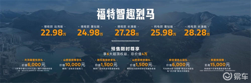 在本届广州车展上,全球首款“全地形露营SUV”——福特智趣烈马得到了众多媒体和观众的关注。该车型增程版提供远湾、墨钻、长滩三款配置,预售价分别为22.98万元、24.98万元与27.28万元,CLTC综合续航里程达1220公里;纯电版包含墨钻与长滩两款配置,预售价分别为25.98万元与28.28万元,续航里程达650公里。预售期间,用户可尊享总价值高达4万元的6大预售权益。