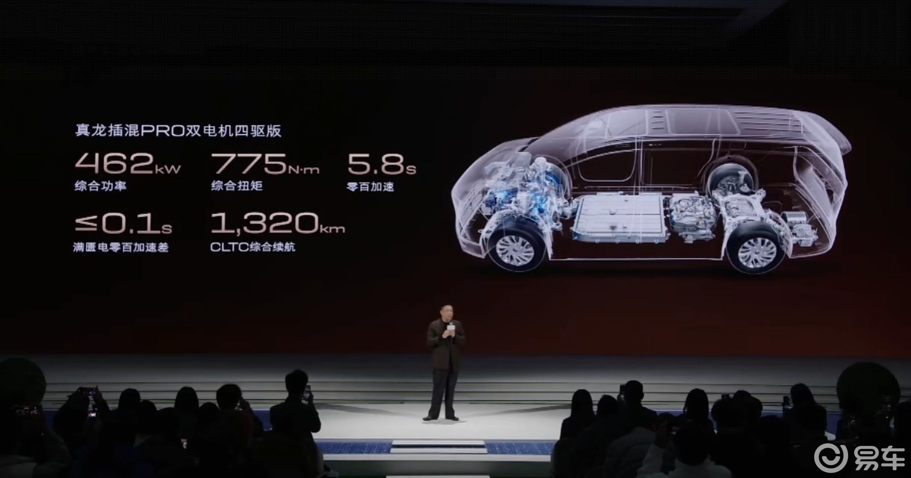 动力系统上,至境世家搭载了一套插电混动系统,由双电机组成四驱,综合输出功率462千瓦,扭矩775牛·米,0-100公里/小时加速时间为5.8秒。在混动模式下,它的CLTC综合续航可达1320公里,纯电续航224公里。官方称其亏电油耗为每百公里7.3升,并支持快充,30%到80%充电约需20分钟。