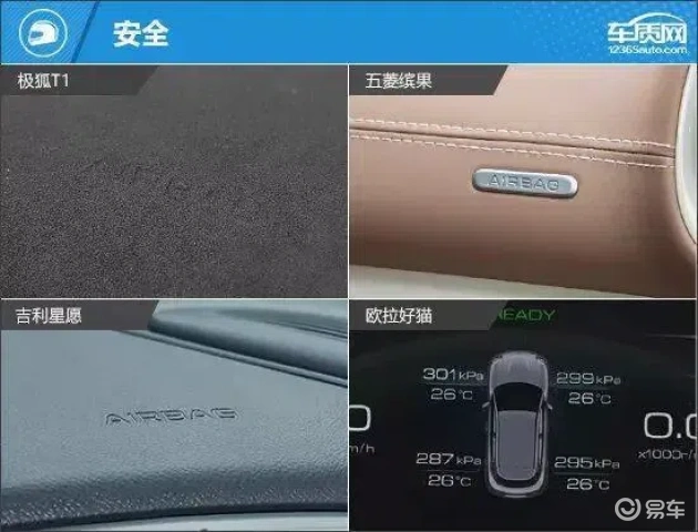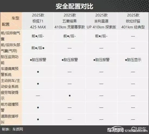 安全配置方面,极狐T1表现最为全面。除了基础的被动安全配置外,其还配备了车道偏离预警系统、主动刹车/主动安全系统以及前方碰撞预警等主动安全配置。五菱缤果的亮点在于疲劳驾驶提示,而欧拉好猫则配备了更为直观的胎压显示功能,相较其他三款车型的胎压监测更具优势。