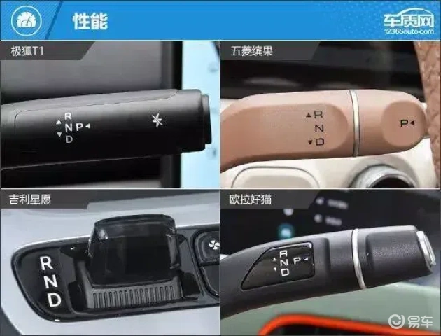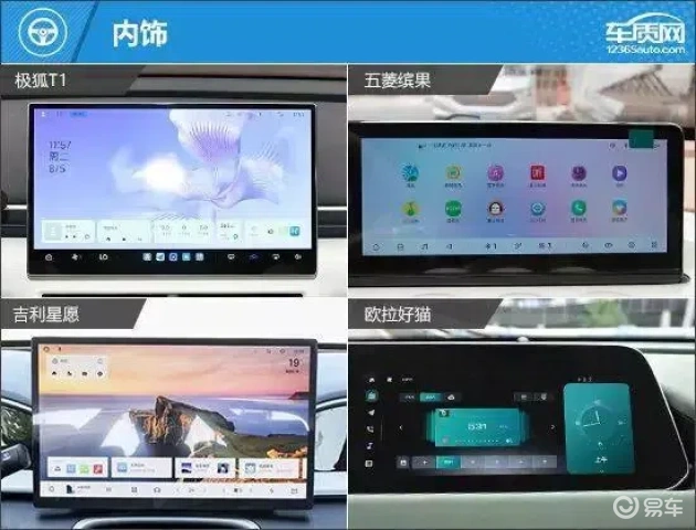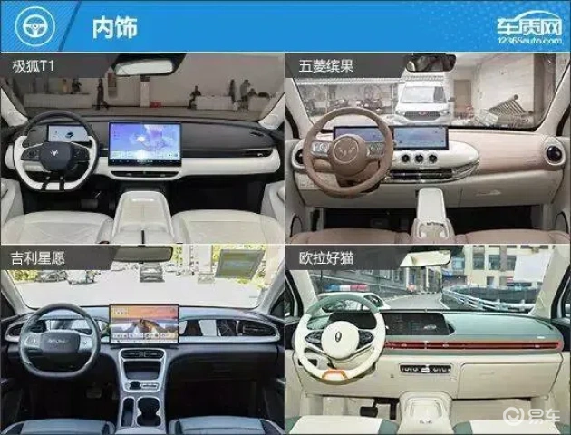 内饰方面,四款车型的设计风格大致分为两类。极狐T1和吉利星愿采用对称式中控台布局,整体给人一种清爽简约的感觉。五菱缤果和欧拉好猫则配备双联屏,浅色系配色方案搭配大量曲线和圆角元素,视觉效果更具亲和力。