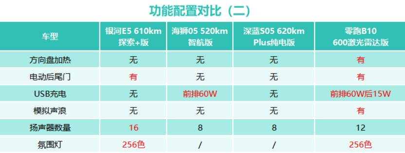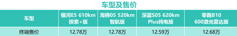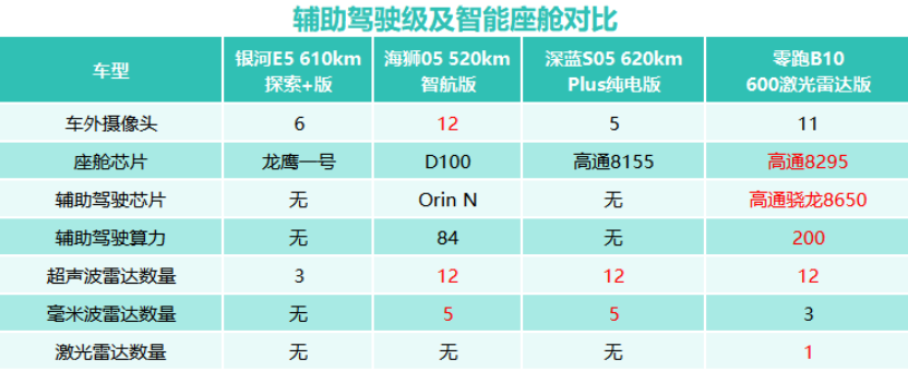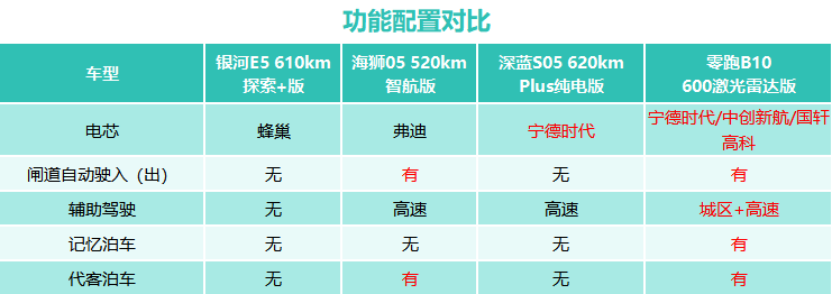 那如果说刚才对比的车型中,零跑B10拥有更全的欧盟认证是他的产品力的展现。那同价格区间他对比以上几款车型又多了什么样的配置,让B10足以算得上是一款“有诚意”的产品呢?我们选取售价都在12万多的银河E5 610km探索+版本、还是05EV 520km智航版、深蓝S05 620kmPlus纯电版以及零跑B10 600km激光雷达版来做一下配置上的简单对比,看看能不能发现一些端倪!