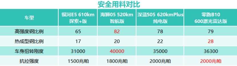 当然,不仅是配置。在用户感知度更低的车身安全用料上,零跑B10和刚上市不久的比亚迪海狮05EV分别拥有两项成绩的领先,而如果加上零跑B10所搭载的只有几十万的高端车型才有的高速爆胎控制系统的话,那在这个领域,我们依旧可以认为,这就是零跑汽车,在面对这个级别众多的传统大厂的时候,所给出的质价比和企业的诚意。