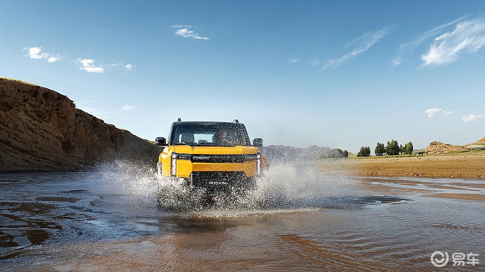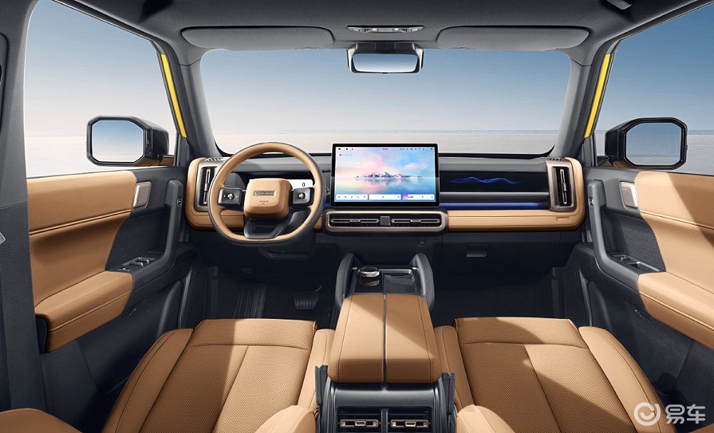 外观采用大量平直线条,前脸“倒L”型几何大灯与宽厚的熏黑前保险杠营造出坚实感,侧面的黑色轮眉、车顶行李架以及标志性的侧开电吸尾门和“小书包”式备胎,共同构成了适合户外的野性风格。