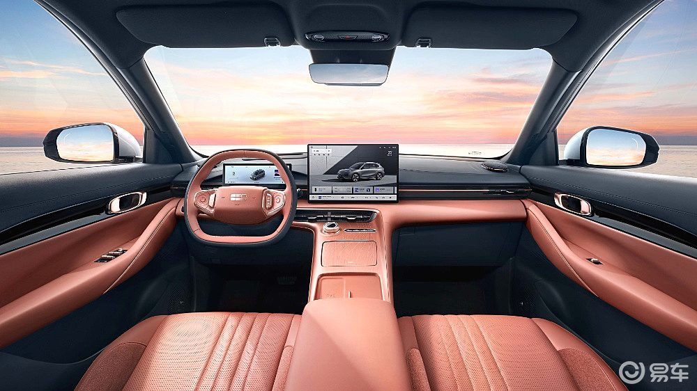 银河E5的内饰主打科技温馨风格,座舱内最引人注目的是由10.2英寸全液晶仪表和15.4英寸悬浮式中控屏组成的显示组合,整体布局简洁。