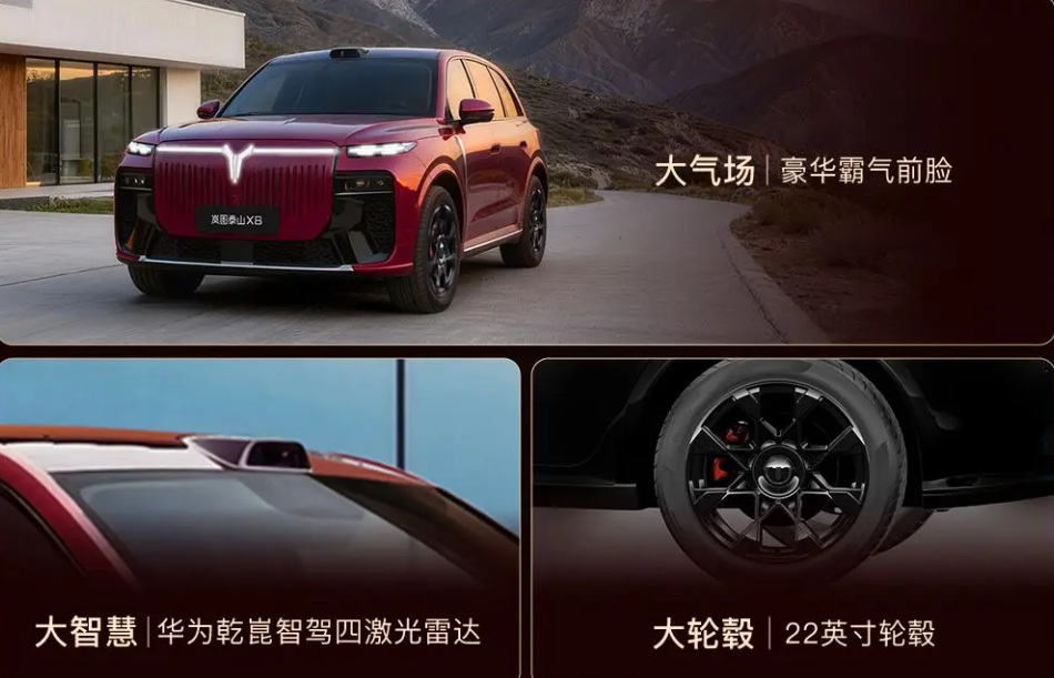 从已曝光信息来看,岚图泰山X8在产品定位上聚焦大型五座SUV细分市场,车身尺寸表现突出,长宽高分别达到5200/2025/1814mm,轴距达3090mm,凭借大五座布局,将空间优先让渡给前后排乘员,打造舒适驾乘体验。外观设计延续岚图泰山家族风格,采用“天地共雅美学”设计理念,扶摇直上格栅、水击三千日行灯等细节元素,搭配多种车身配色,兼具大气质感与东方韵味。