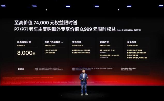 此次小鹏P7焕新,构建了更丰富的产品矩阵,各版本定价清晰:702 Max版20.38万元、820 Max版22.38万元、750四驱Max版24.38万元、750四驱鹏翼Ultra版30.18万元。在Max版基础上,用户加1.2万元可升级为搭载2颗图灵AI芯片+第二代VLA的Ultra SE版,加2万元则可升级至配备3颗图灵AI芯片+第二代VLA+VLM大模型的Ultra版,不同需求的用户均可找到适配选择。为回馈消费者,即日起至2026年3月31日24点前下定,用户可享至高74000元配置限时权益,涵盖新春购车补贴、选装基金/金融权益二选一、置换/复购专属福利,还有外观装备半价、主动式升降尾翼赠送等多重礼遇,鹏翼版更额外获赠副驾零重力座椅。