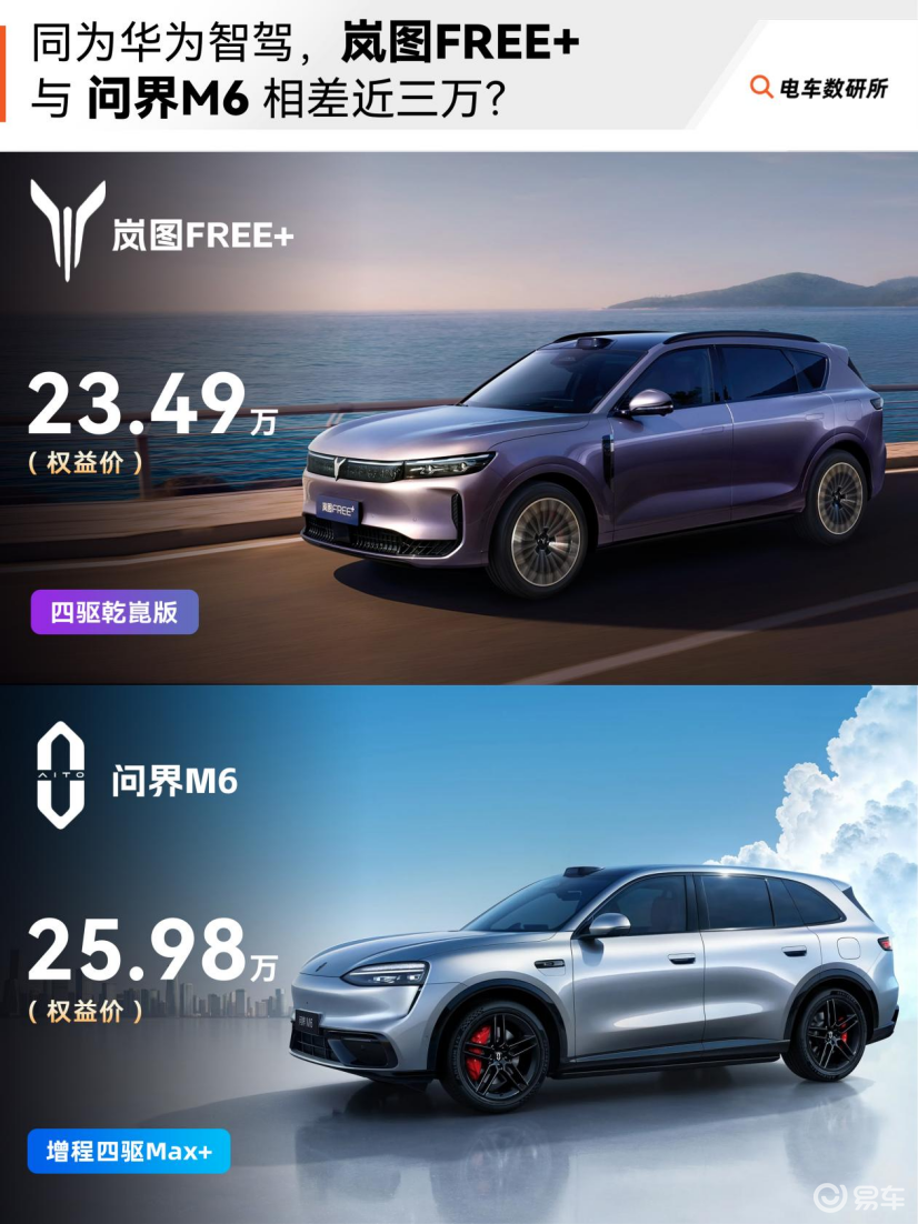 岚图FREE+全系标配了45度大电池,四驱版纯电续航259公里,日常通勤如果能做到勤充电,基本可以当纯电车开,省下的油钱很客观。问界M6则提供了不同的电池包,更灵活不过价格会更贵。